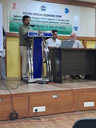 As per the directives of the Central Vigilance Commission, an awareness programme was organised at the DC Office on 4th October 2024. Topic of the programme was ‘Cyber Hygiene and Security’ and the session was handled by Kerala Police Cyber Cell officials. They made a detailed presentation on virtual arrest, hacking, etc. Shri P.G. Laloo, DCC presided over the programme. ADCs, Customs officials and unit representatives attended the programme. SEZEPC had associated with the programme.